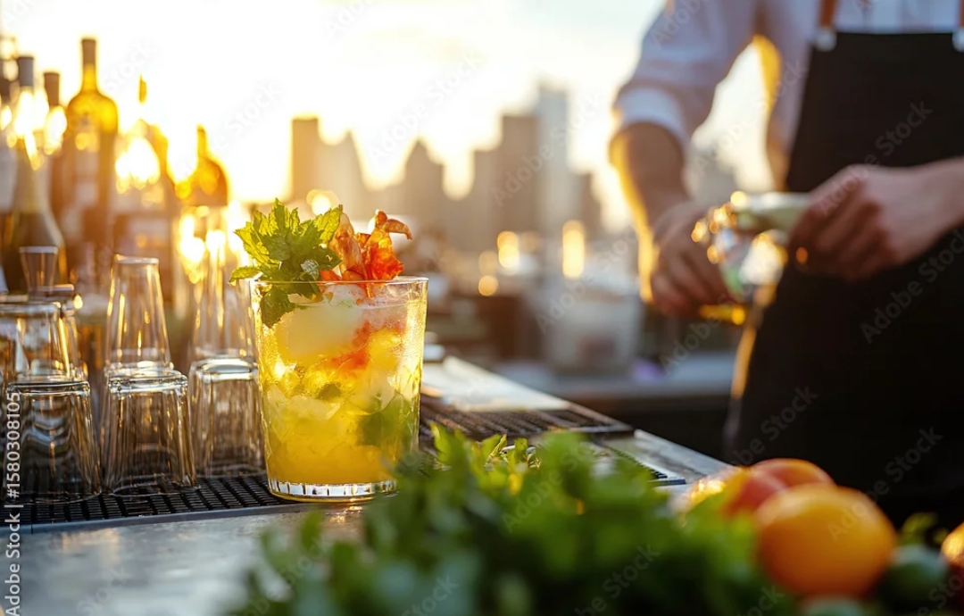 プロの技とカクテルの美しさが融合する、贅沢で華やかなパーティー空間。