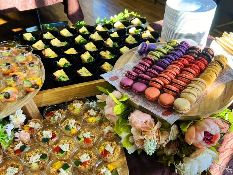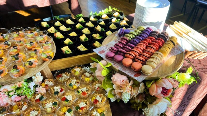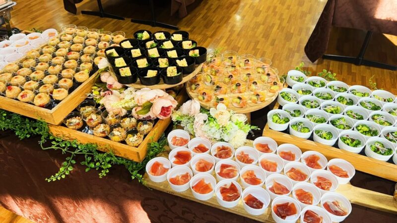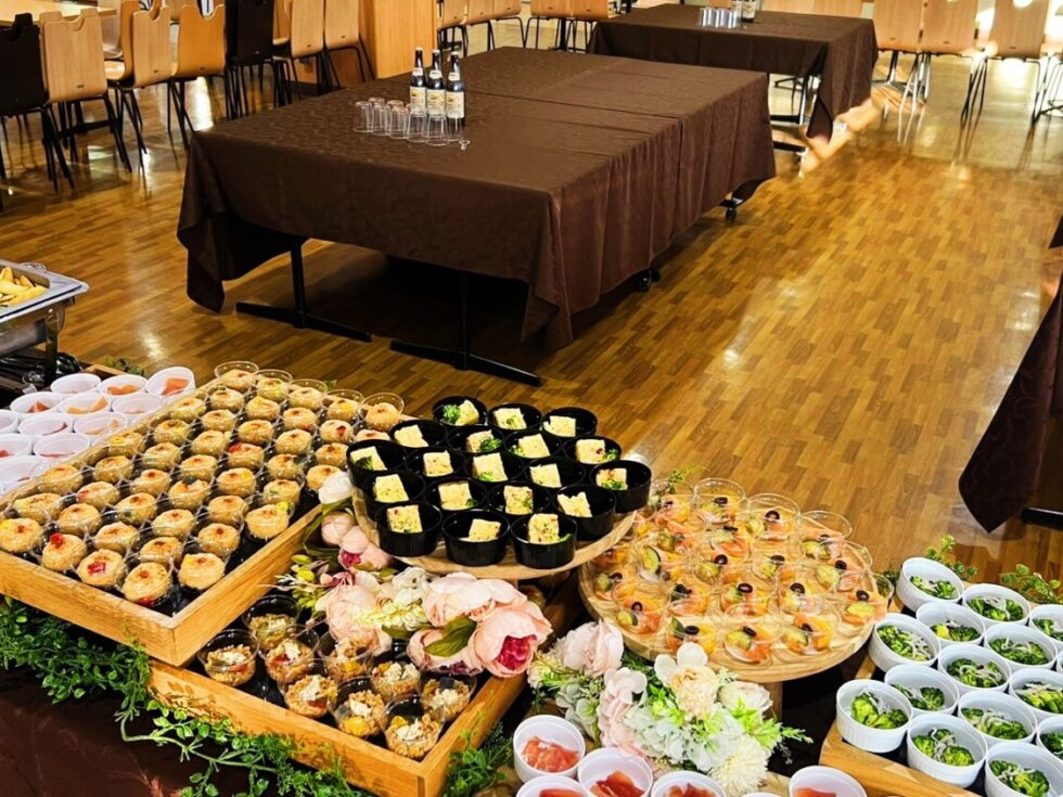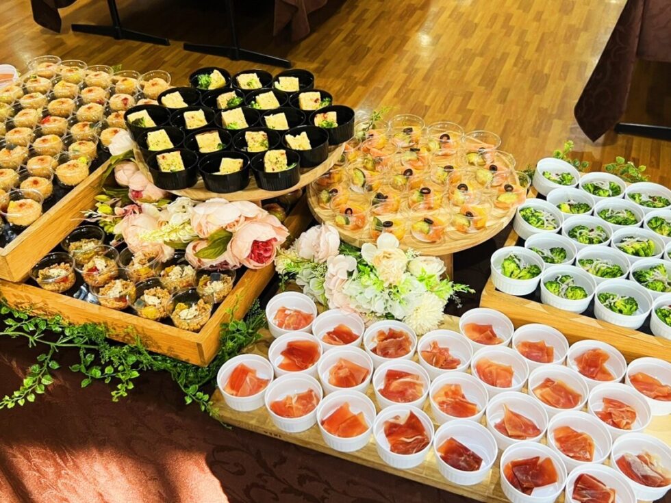 本案件では、50名様分のお食事とお飲み物を、ご参加者様同士が自由に移動しながら会話を楽しめるように、立食形式で、ご用意しました。