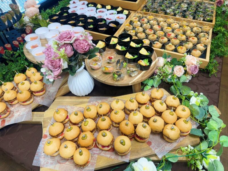 「ミニハンバーガー」は、人気のあるメニューで、特に若いご参加者様に好評でした。ご参加者様が見て楽しめるよう、セッティングにもこだわりました。
