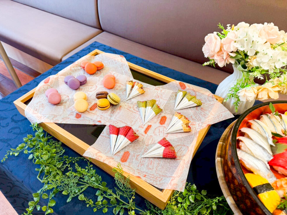 「マカロン・アソート」は、色とりどりの多彩なフレーバーをご用意しました。目にも鮮やかなその可愛らしさが会場に彩りを添え、「どれにしようか」と選ぶ楽しさでも皆様の笑顔を誘いました。