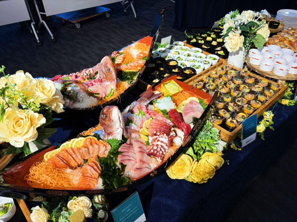 ローストビーフカッティングのライブケータリングに加えて、豪華なお食事も多数ご用意し、「鮮魚のお造り〜舟盛り〜」は多くのご参加者様から手に取っていただきました。